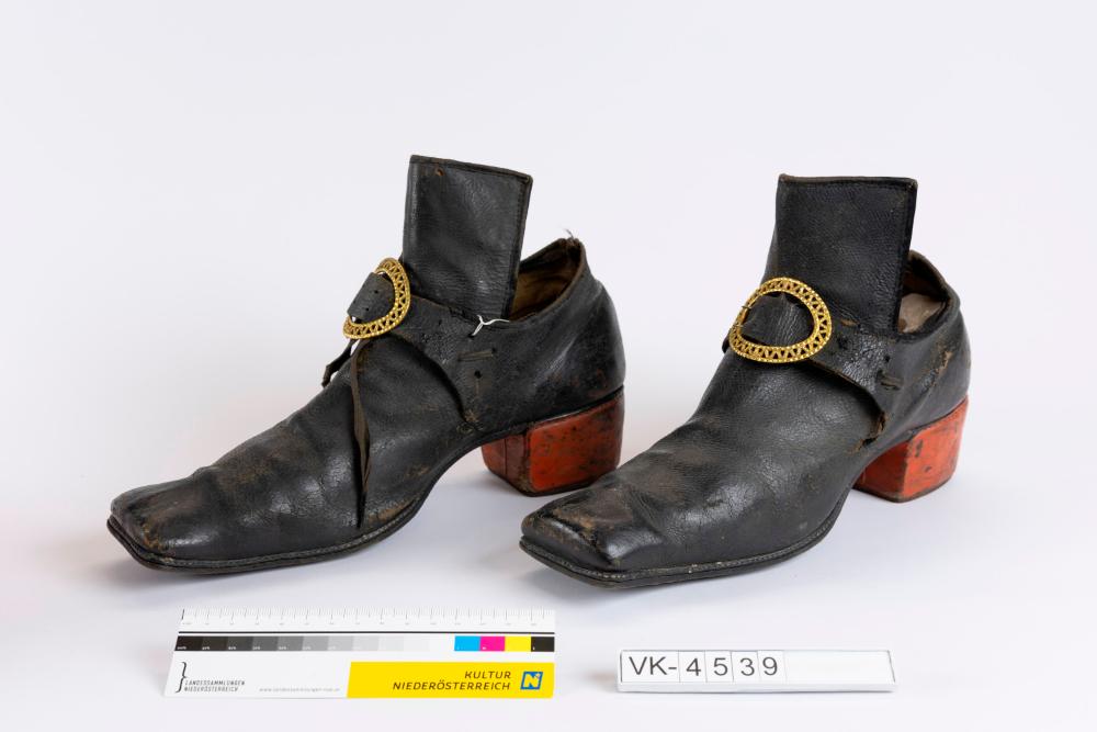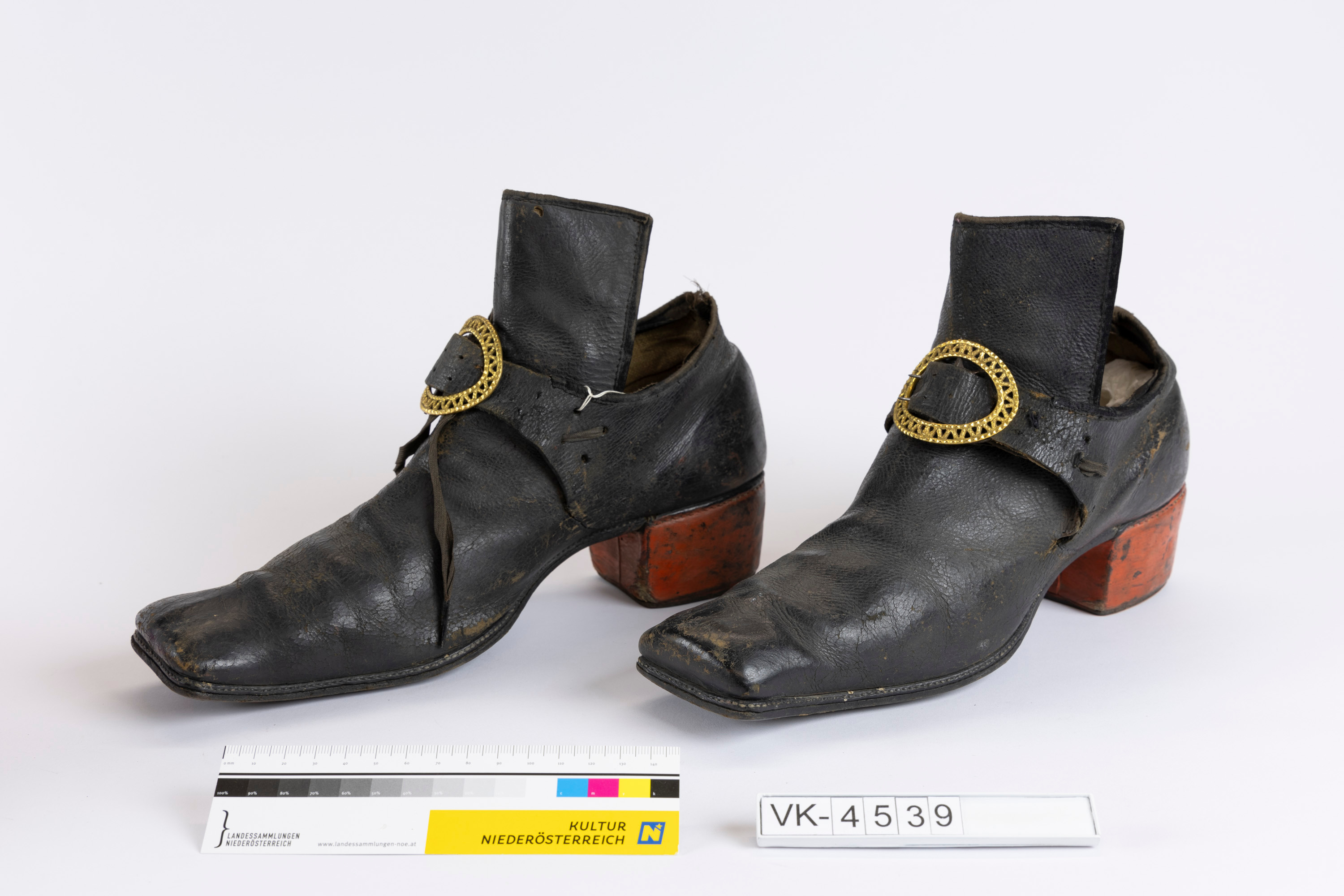 Ein Paar (a, b) schwarze Herrenschnallenschuhe mit eckiger Spitze und roten Absätzen. Die Schuhschnallen sind oval, aus in Zackenmuster durchbrochenem Messing.