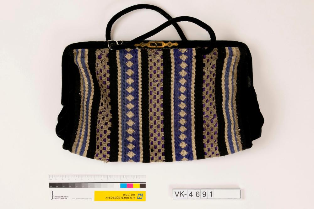 Kleine Handtasche aus zusammen gesetzten Strickmustern in beige, braun, blau und violett. Die Seitenteile der Tasche sind mit schwarzem Samt gefasst, der Henkel ist ebenfalls aus schwarzem Samt, die Tasche hat einen Messingverschluss und ist mit hellbraunem Stoff gefüttert.