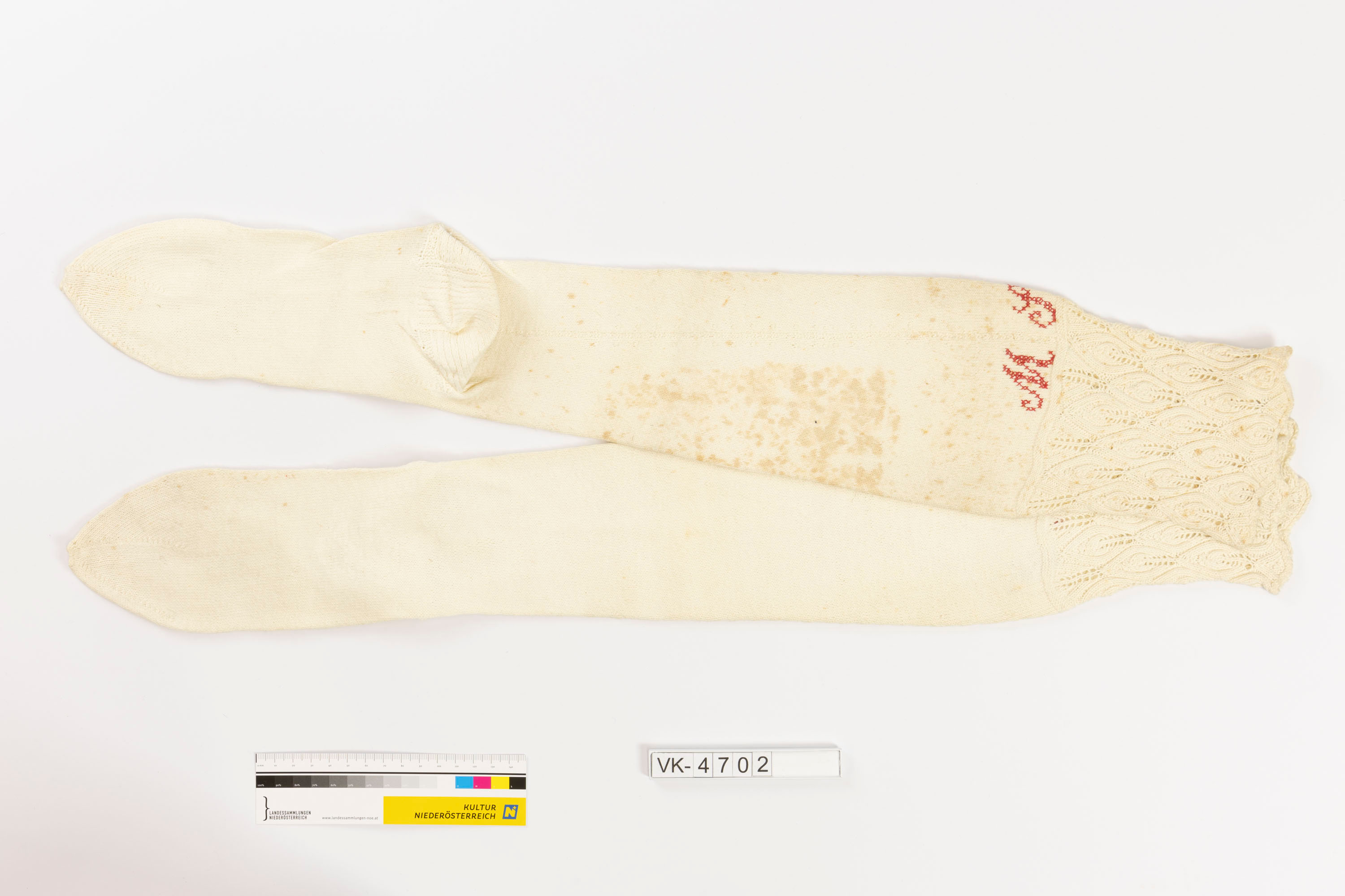 Ein Paar (zusammen genäht) weiße Damenstrümpfe aus Baumwolle mit Rautenmuster im Randbereich und Bestickung mit rotem Garn: "MS".