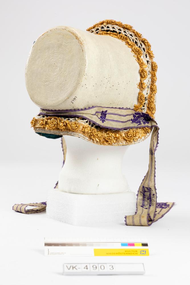 Haube mit zylindrischem Strohhauptteil, weiß lackiert, mit Strohdurchbruchmuster am Rand und Naturstrohverzierungen. Die Haube ist mit grüner Baumwolle gefüttert und mit einem violett geblümtem Seidenband zu binden.