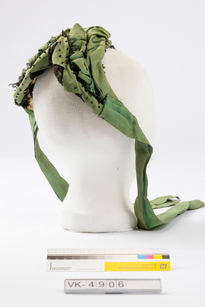 "Widderhorn"-förmige Damenhaube aus hellgrünem Seidentaft, in Rüschen gelegt, mit Bindebändern. Die Haube ist mit einer schwarzen Tüllspitze besetzt und mit schwarzen Perlen bestickt, mit Tüll gefüttert.