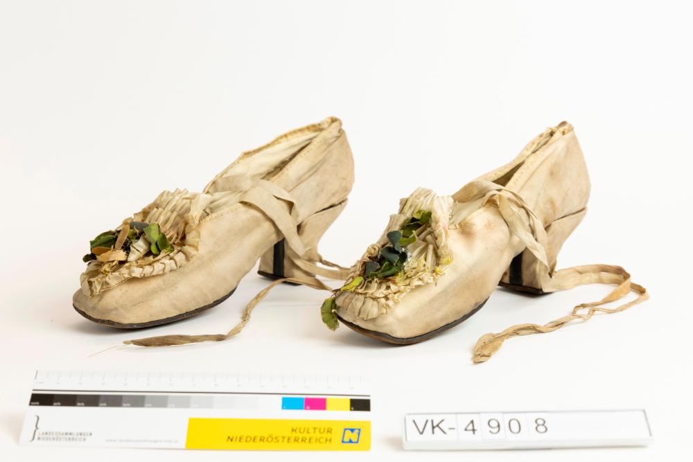 Ein Paar (a, b) beige (ev. ehemals weiße) Damenschuhe aus Seide mit halbhohen Absätzen und Ledersohle. Die Schuhe haben Bändchen zum Binden und sind vorne mit einer Auflage aus Stofffaltenrüschen und Resten von Seidenblumen verziert.