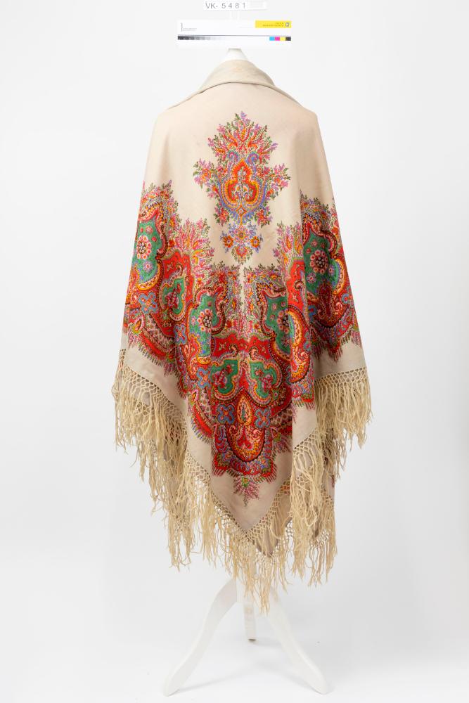 Großes Schultertuch aus beigem Wollstoff mit beigen vernetzten Wollfransen und einem umlaufenden, breiten, mehrfärbigen Muster aus annähernd drei- und vierpassförmigen Ornamenten mit Blütenranken.