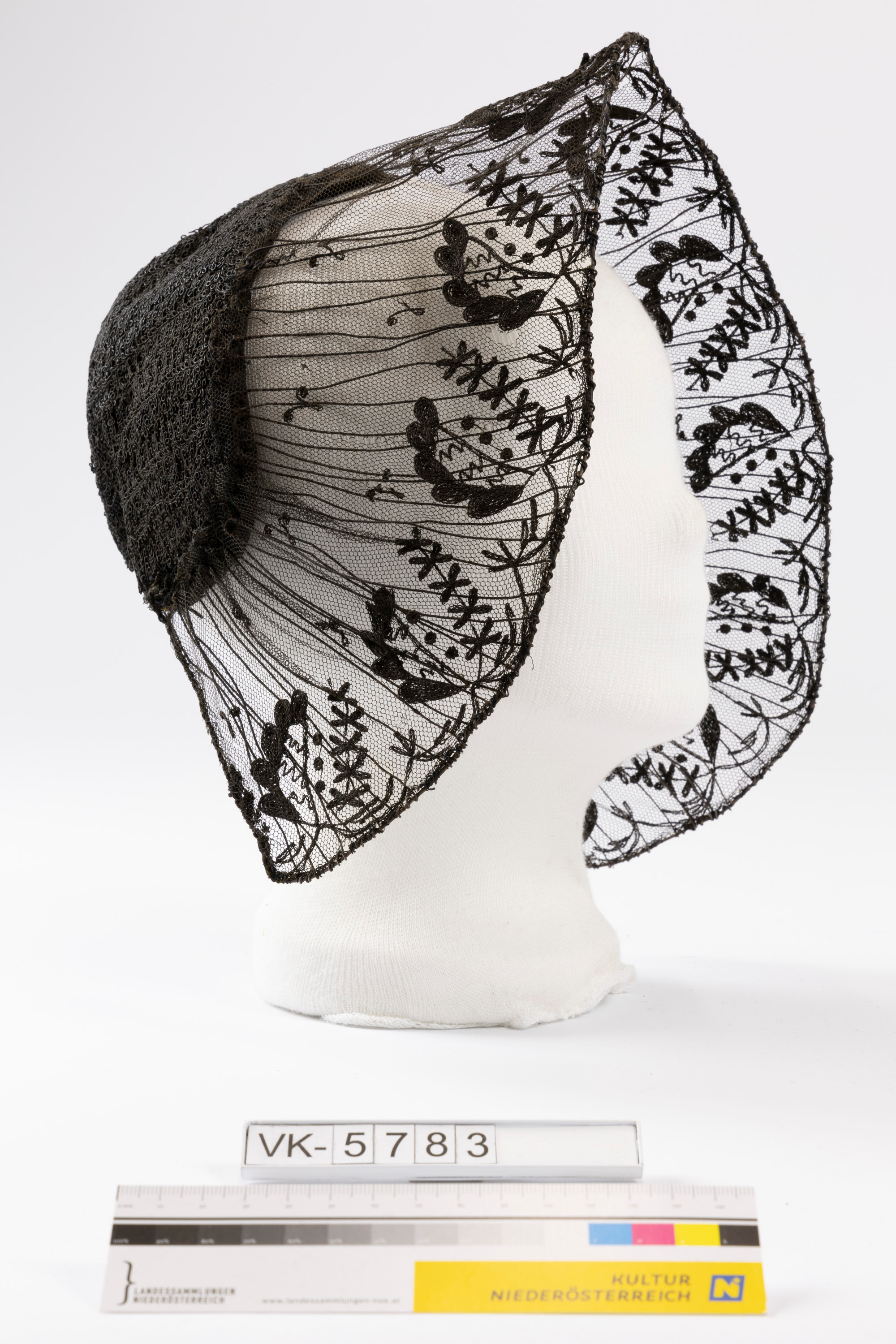 Schwarze Drahtlhaube aus Guipurspitze, am Boden mit Karton verstärkt, mit Nackenzug und einem breiten Tüllspitzenschirm mit Drahtverstärkung. Die Haube ist mit Leinen gefüttert.