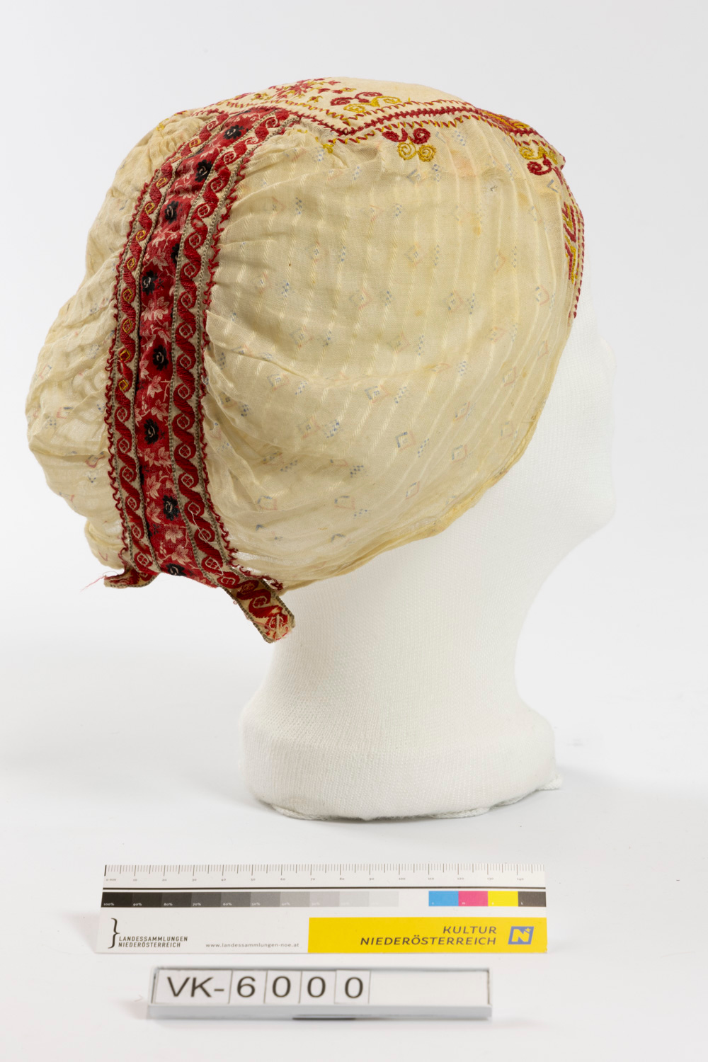 Weiche weiße Leinenhaube, großteils aus gemustert bedrucktem Stoff, großflächig bestickt mit gelbem, rotem und blauem Garn.