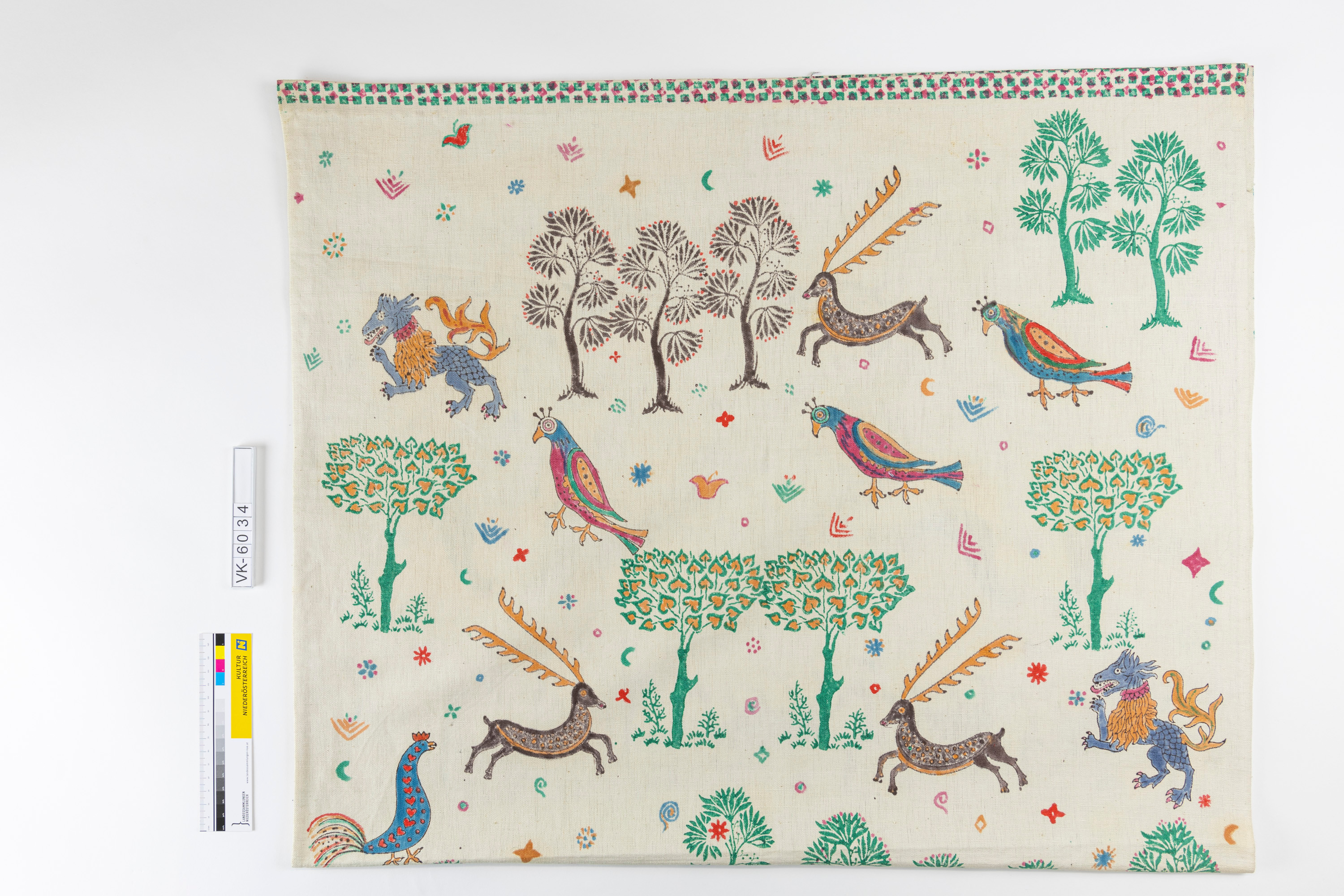 Großer weißer Leinenwandbehang, mehrfärbig bedruckt mit Tieren und Fabelwesen, dazu Bäume und Pflanzen. Unter- und Oberkante sind je mit einer mehrfärbigen Musterborte bedruckt.