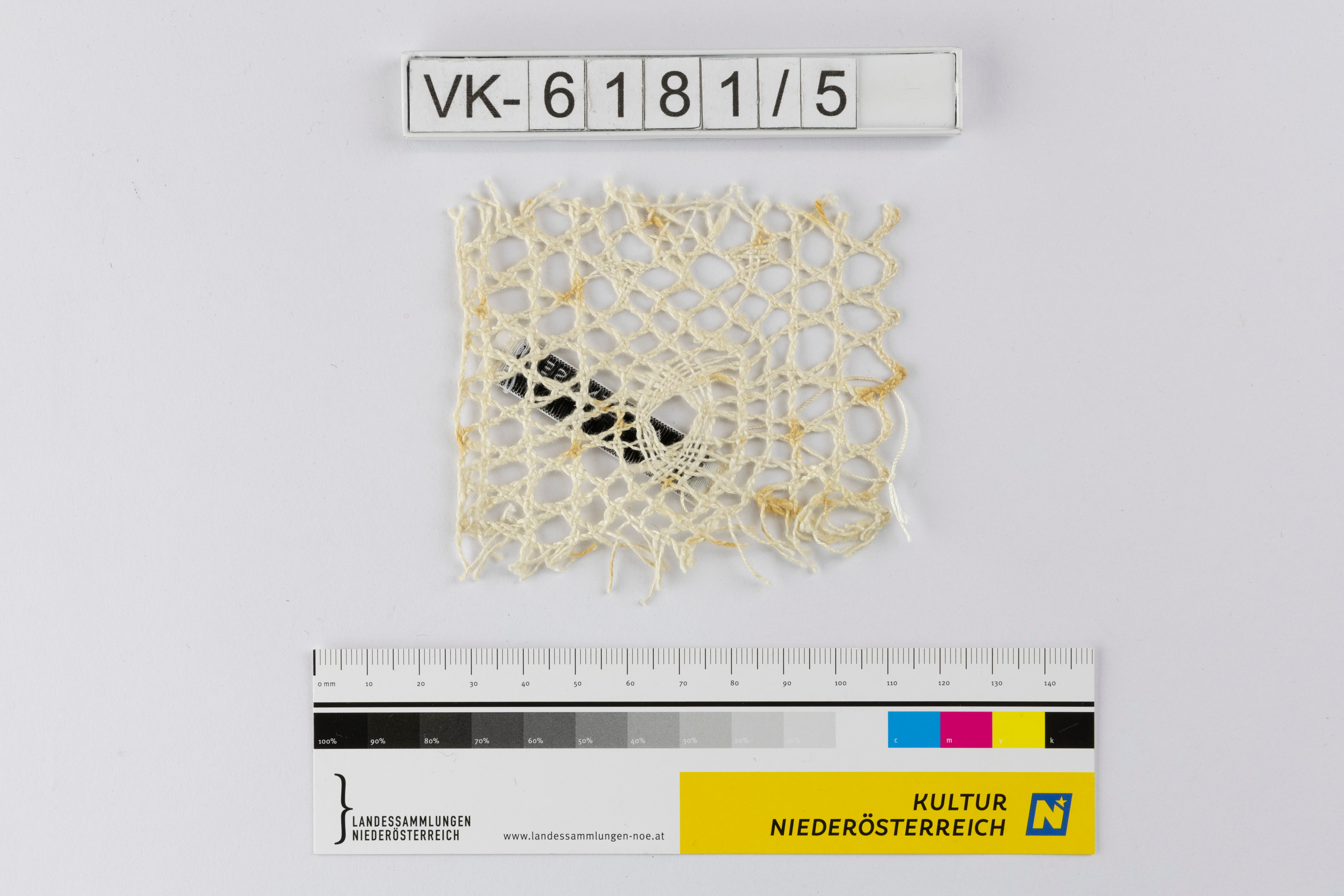 Ein Stück grobmaschige Klöppelspitze mit einem ovalen Musterelement.
