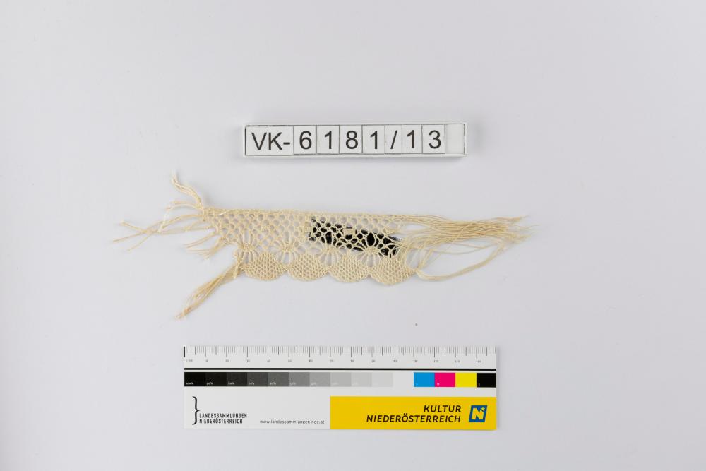 Ein Stück Klöppelspitze mit gewelltem Abschluss, variierender Netzdichte und kleinen elliptischen Elementen.
