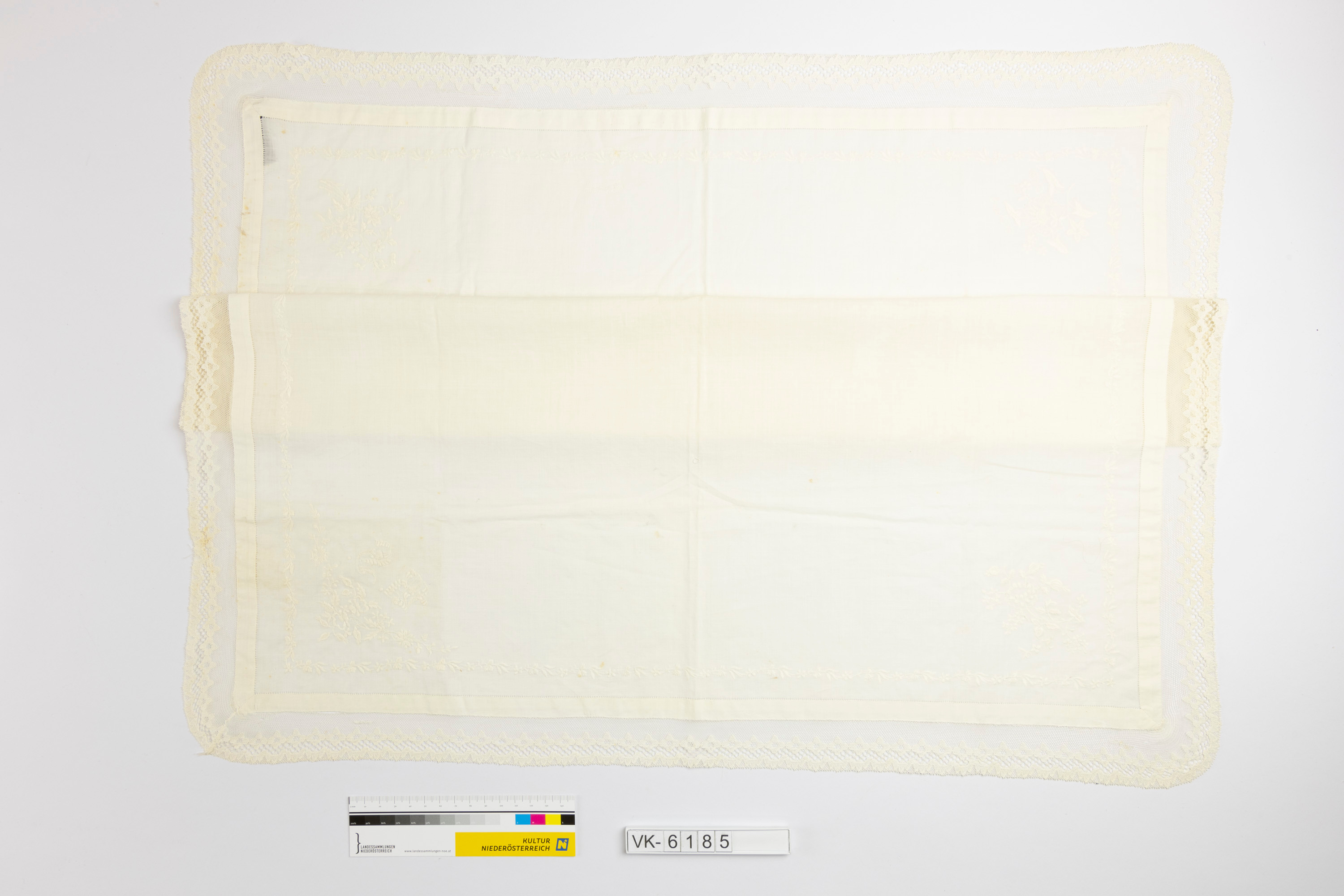 Rechteckiges Deckchen aus Baumwollbatist, gefasst mit weißer Klöppelspitze. Das Deckchen ist im Plattstich mit einer umlaufenden floralen Borte und in jedem Eck mit einem Blumenbukett sowie den Initialen "R.S." bestickt. Zusätzlich hat das Deckchen einen schmalen Ajoursaum.