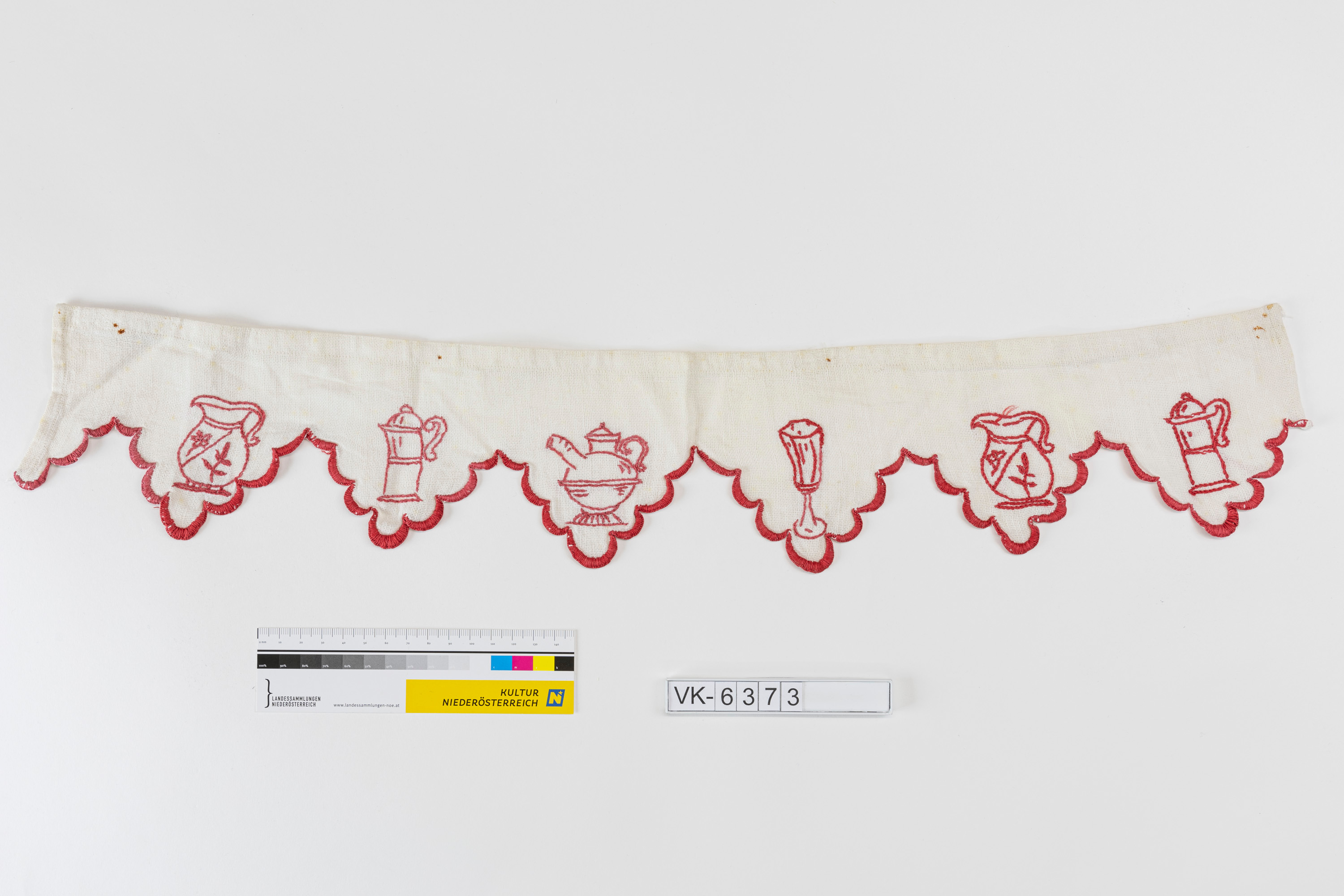 Kastenband (laut Inventarbuch von einer Kredenz) aus weißem grobem Leinenstoff, mit gezackt verlaufender, rot gefasster Bogenkante, in den Zacken sind verschiedene Geschirrteile in rot dargestellt.