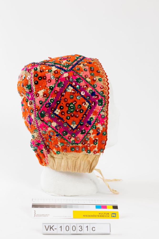 Gehäkelte Haube mit Bestickung in verschiedenen Rottönen sowie mit Pailetten und Glasperlen. Die Haube ist Teil einer ungarischen Frauentracht, die für das Donaumuseum angekauft wurde.