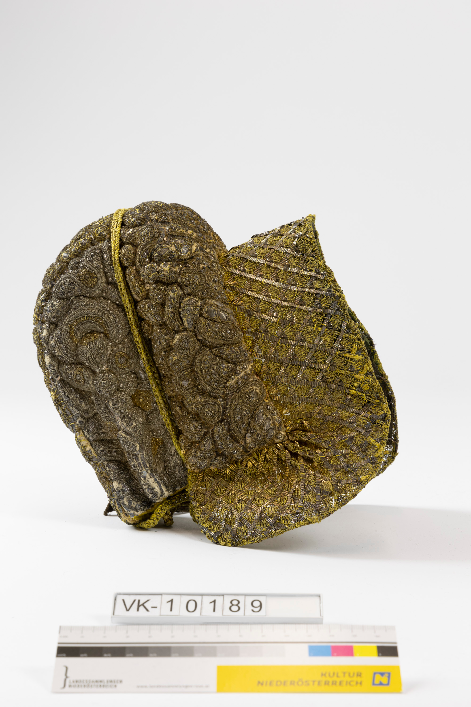 Drahtverstärkte Wiener Goldhaube, vollflächig mit Goldreliefstickerei, Golddrahtspitze und Pailletten verziert. Die Haube hat einen Nackenzug mit geflochtenen Goldbändchen. Die Haube ist teilweise mit goldfarbenem Seidentaft gefüttert und hat Bindebändchen aus Köperband.