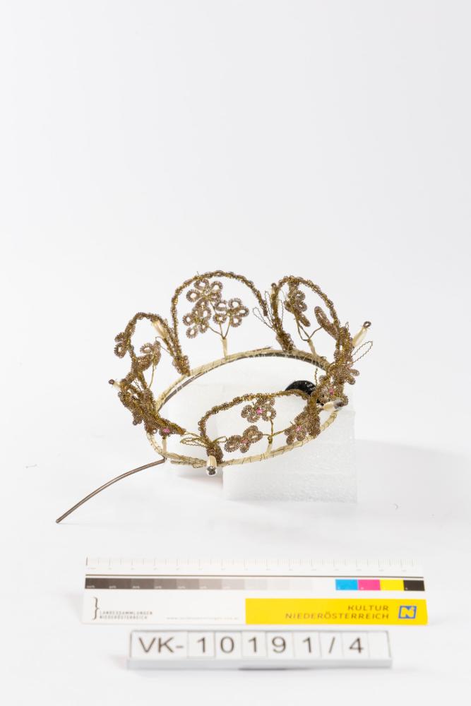 Kleines Brautkrönchen, goldene Bouillonarbeit mit Pailletten und Kunstperlen auf einem Drahtgestell.