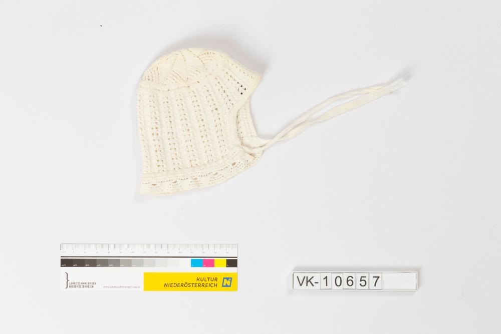 Weißes, im Lückerlstreifenmuster gestricktes Babyhäubchen mit Spitzenbesatz und Bindebändchen.