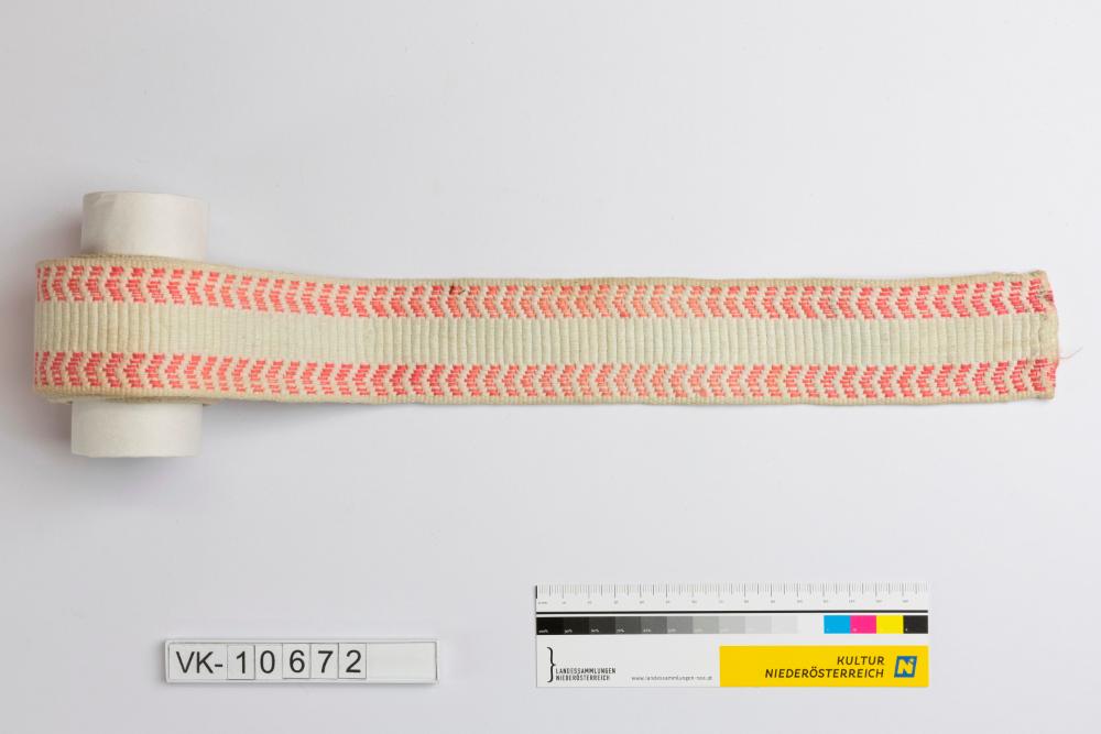 Weißes Wiegenband mit rosa Winkelmuster an beiden Rändern.