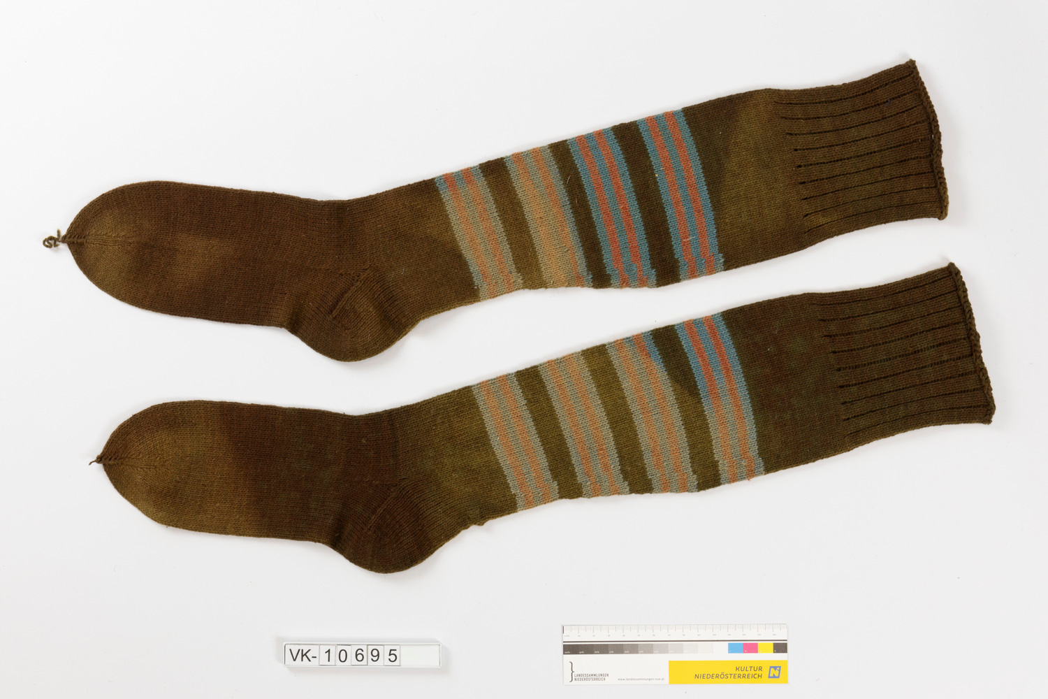 Ein Paar braune Baumwollstutzen (a, b) mit blau-roten Streifen am Schaft.