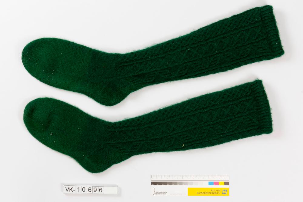 Ein Paar dunkelgrüne Wollstutzen (a, b) mit unterschiedlichen Strickmustern am Schaft.