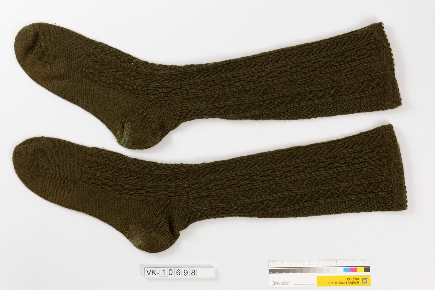 Ein Paar braune Wollstutzen (a, b) mit wechselnden Strickmustern am Schaft.