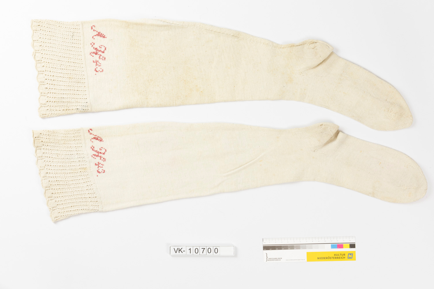 Ein Paar weiße Baumwollstutzen (a, b) mit rosa Bestickung: "AH 43".