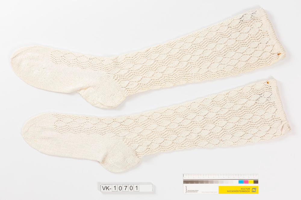 Ein Paar weiße Stutzen (a, b) mit durchbrochener Musterung und glattem Vorfuß.