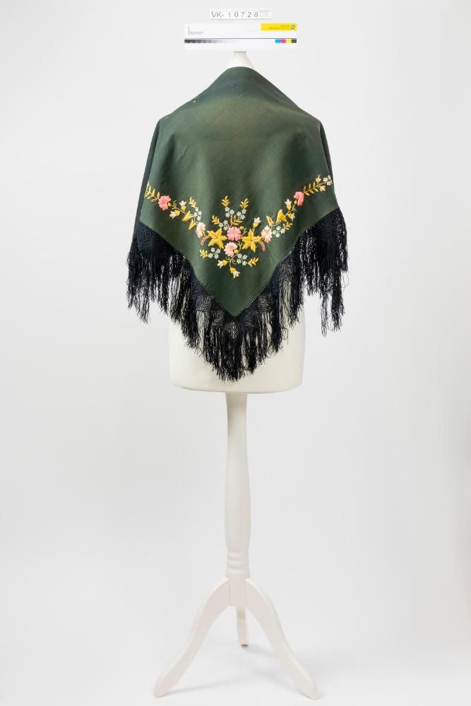 Schwarzes Schultertuch mit geknüpften und vernetzten Fransen an zwei Seiten und einem mehrfärbigen floralen Motiv (aufgestickt) in einer Ecke.