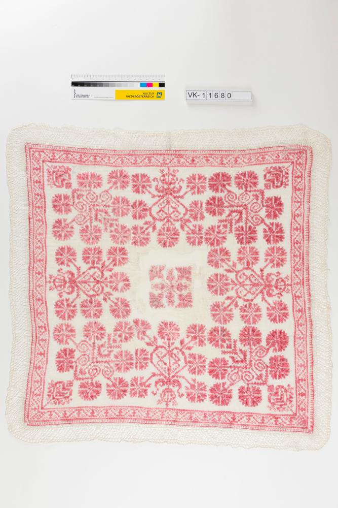 Quadratisches weißes Deckchen mit umlaufendem Spitzenbesatz und großflächiger Bestickung in stilisiert-floralen Motiven mit rotem Garn.