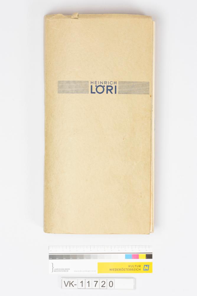 Gebundenes schmales Stoffmusterbuch mit beigem Kartoneinband ("HEINRICH LÖRI"), pro Seite vier gezackt ausgeschnittene Stoffmuster ("Musterkarten Gallasch No. 1114"), mit Kugelschreiber händisch beschriftet.