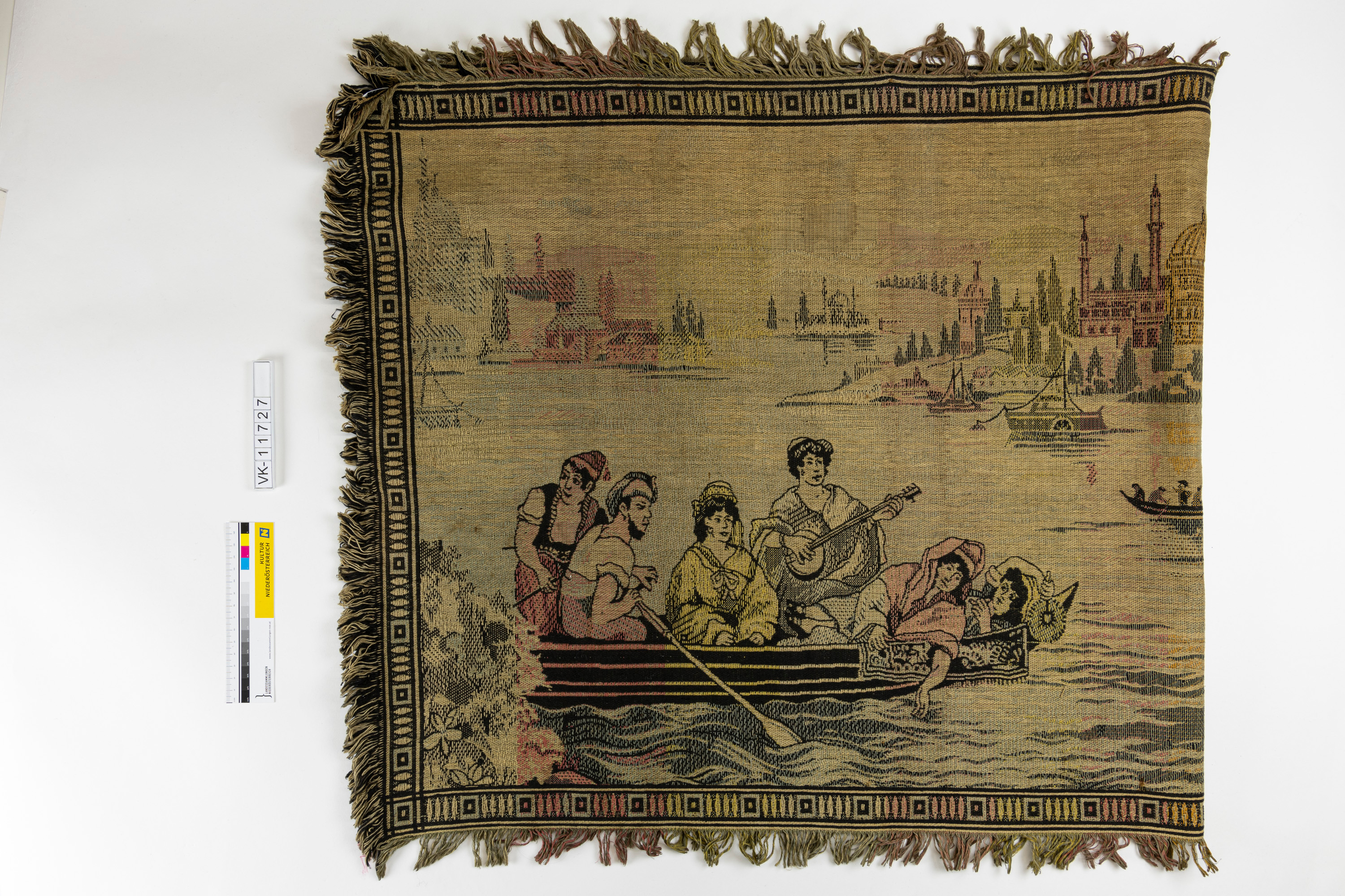 Großer Wandbehang mit umlaufenden Fransen und eingewebtem Muster in blassen Grau-, Gelb- und Rottönen: Boote (mit verschiedenen Personen, u.a. Mandolinenspieler), im Hintergrund eine orientalisch anmutende Stadtansicht. Die Darstellung ist in der Mitte gespiegelt.
