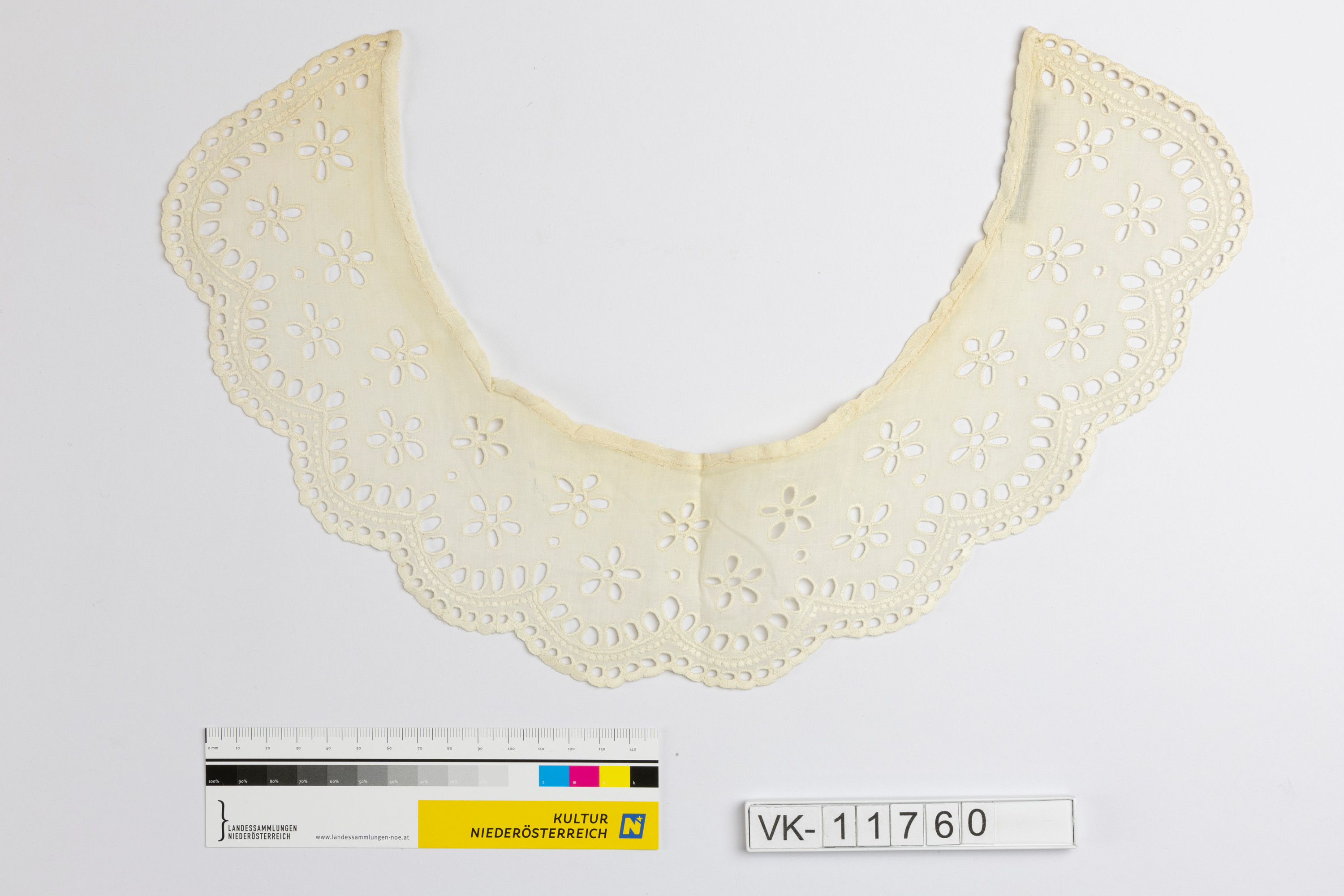 Gewellter weißer Spitzenkragen, in Knopflochstich mit einem einfachen Blütenmuster bestickt.