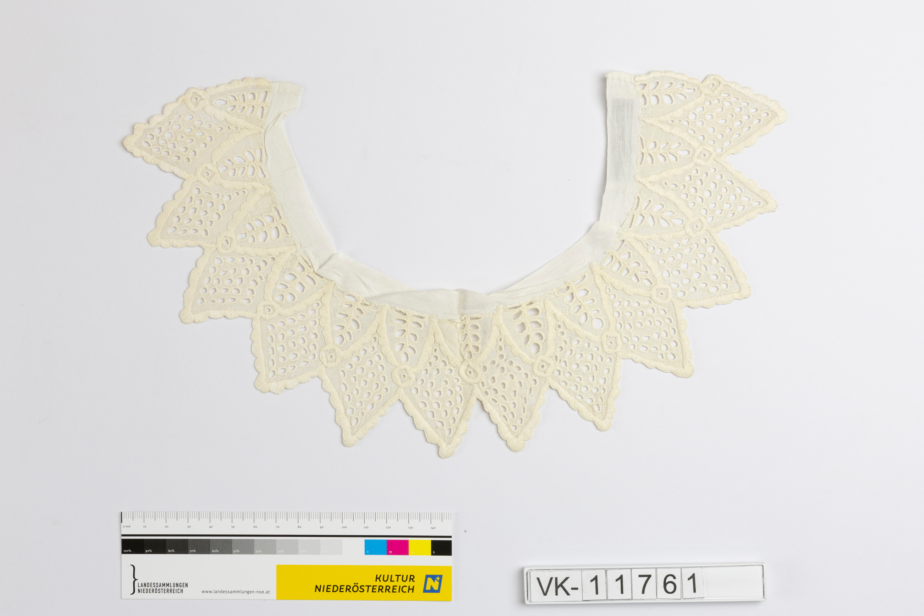 Gezackter weißer Spitzenkragen, in Knopflochstich durchbrochen gemustert.