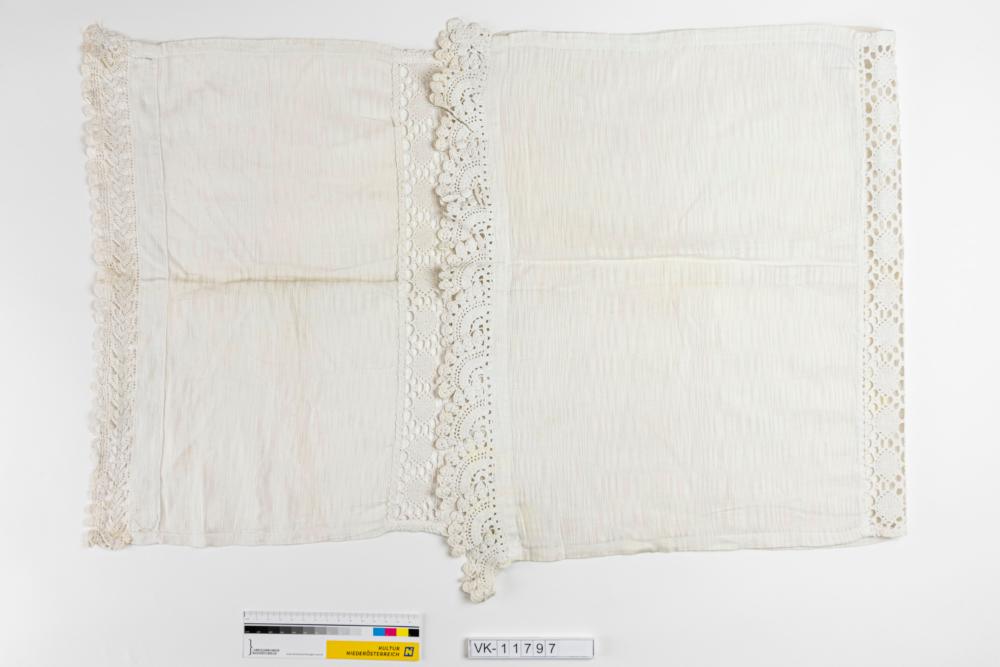 Weißes längliches Deckchen aus drei Elementen, die mit quer verlaufenden Spitzeneinsätzen verbunden sind, die beiden Schmalseiten sind mit unterschiedlichen weißen Spitzen besetzt. Wie VK-11752.