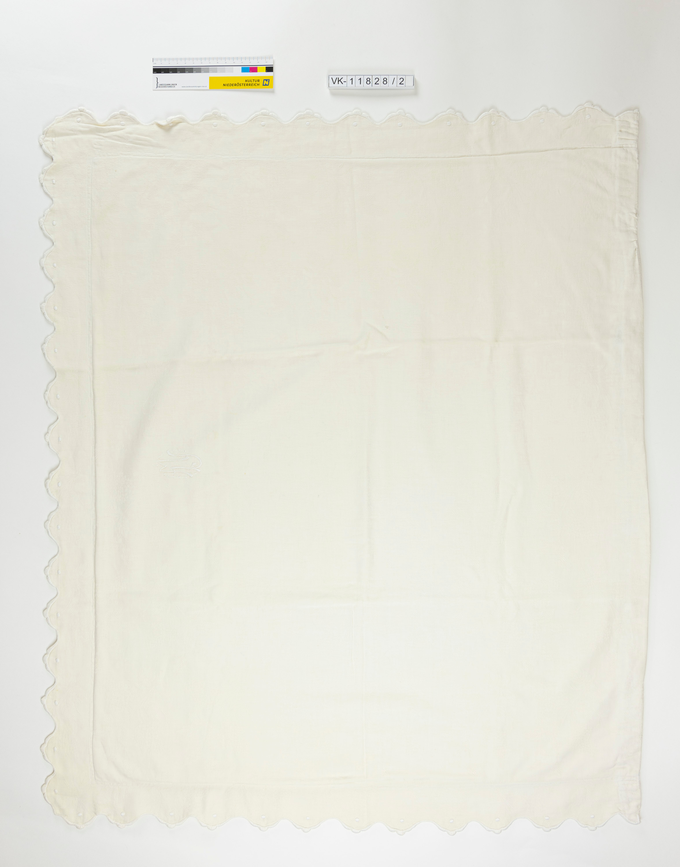 Weißer Polsterüberzug aus Baumwolle mit floralem Muster, über Knöpfe zu verschließen. Drei Kanten sind mit einem weiß umstochenen Wellenrand gestaltet, der Polsterüberzug ist im Stielstich weiß mit einem Monogramm bestickt: "MU".