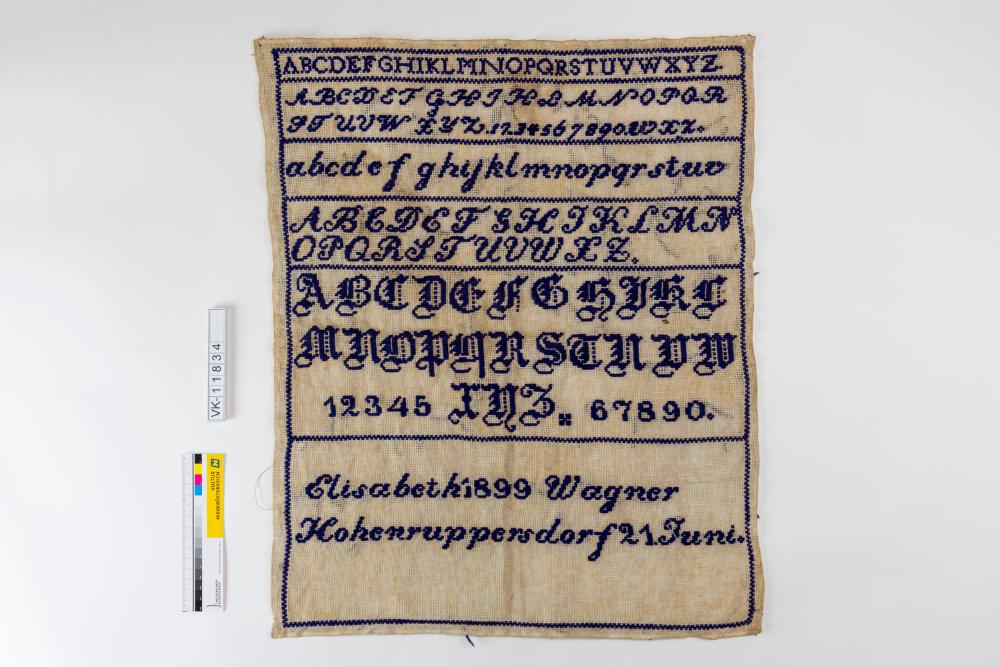 Beiges Aidastofftuch, mit dunkelblauem Garn im Kreuzstich bestickt: Alphabete, Ziffern, "Elisabeth 1899 Wagner Hohenruppersdorf 21. Juni.".