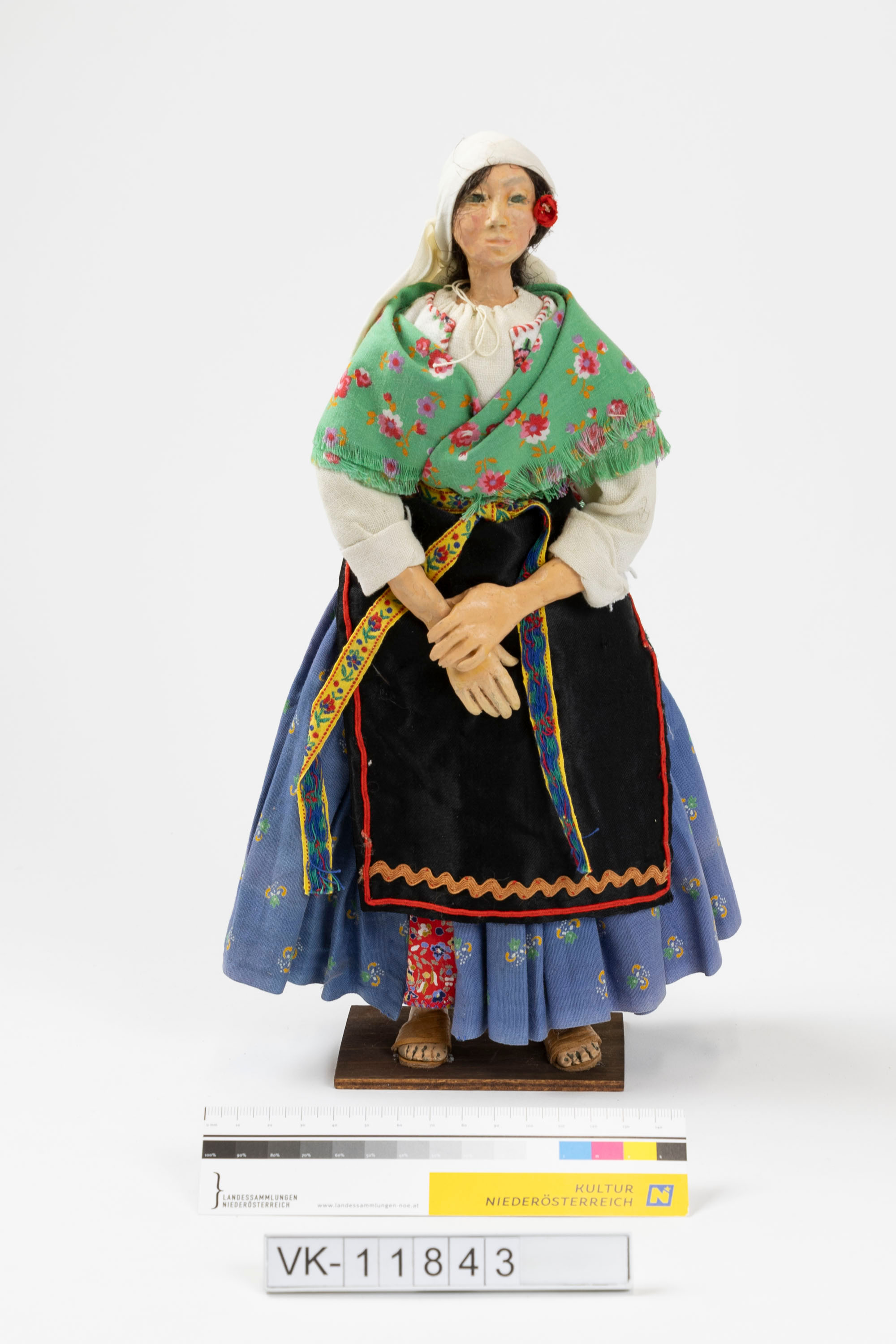 Frauenfigur (Dodolafigur, Dodola ist ein südslawischer Frühlingsbrauch) mit geblümtem blauem Rock, weißer Bluse mit grünem geblümtem Schultertuch, einer schwarzen Schürze mit Wellenborte, einem weißen Kopftuch und einer roten Blume im Haar. Die Figur trägt Pantoffeln und ist auf einer kleinen Holzplatte befestigt.