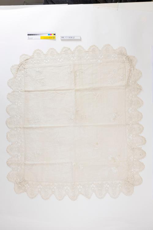 Weißes Leinendeckchen, mit weißem Garn mit verschiendenen floralen Motiven bestickt, umlaufend mit einer breiten Klöppelspitze mit Bogenmuster besetzt.