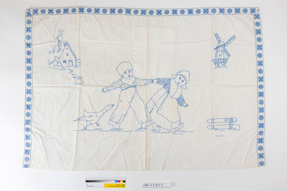 Weißer Wandbehang mit über drei Kanten verlaufender, blauer Zierborte und in blau aufgesticktem holländischem Motiv: Kinder, Haus, Windmühle, Gans. Zwischen den Kindern wurde ein Stoffstück ersetzt.