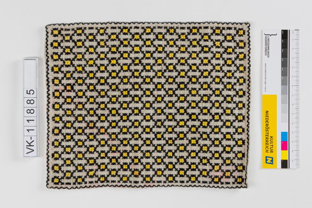 Beiges grobes Leinendeckchen mit schwarzer und gelber Stickerei: Umlaufende Wellenborte, regelmäßiges Muster.