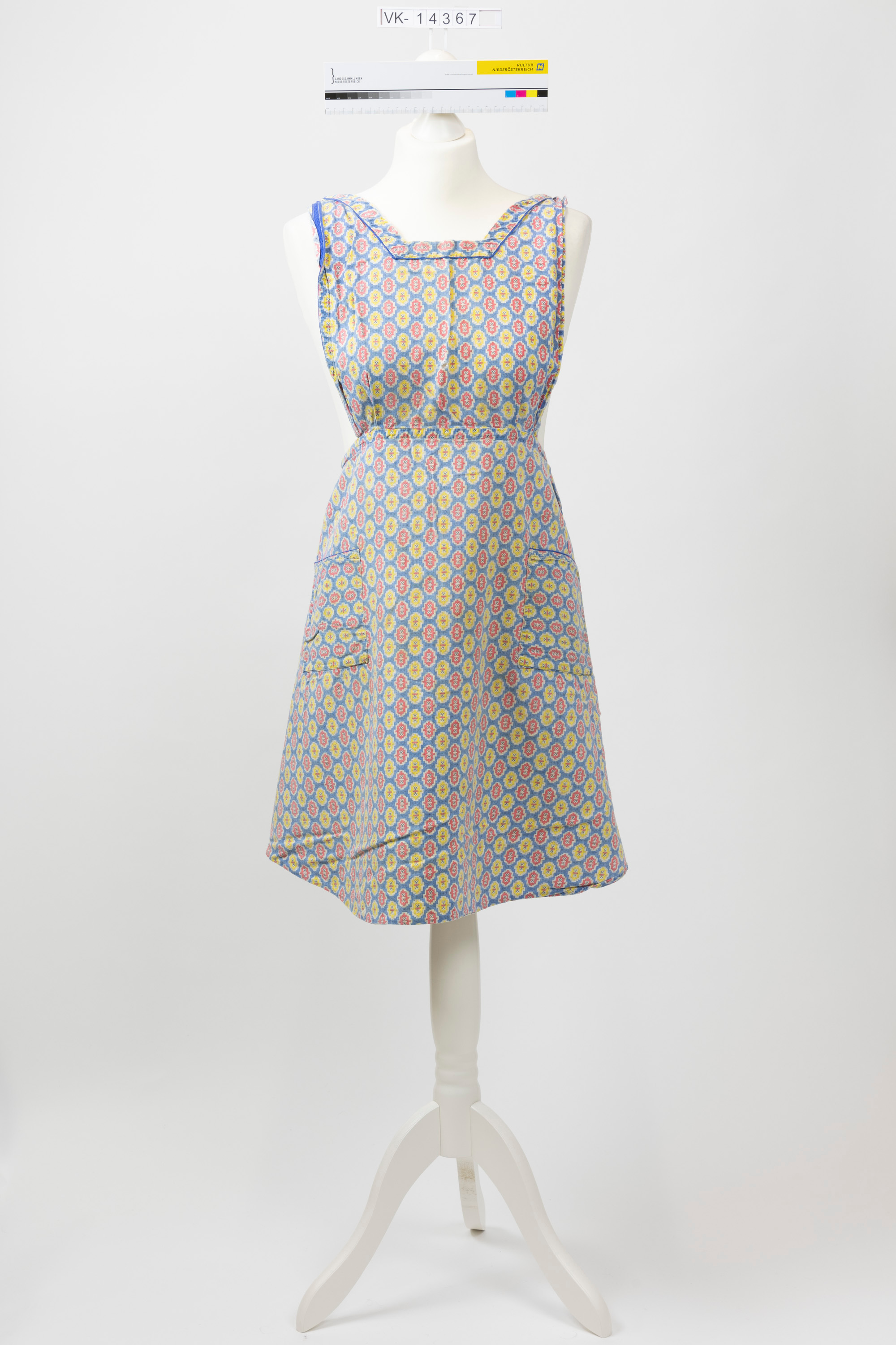Latzschürze mit eckigem Ausschnitt, Bändchen und zwei Taschen, aus gelb und rot gemustertem blauem Stoff.