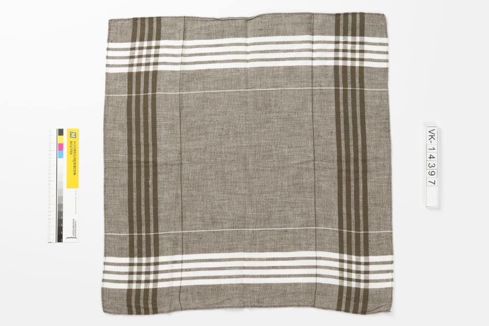 Annähernd quadratisches graues Taschentuch mit dunkelgrauen und weißen Streifen im Randbereich.