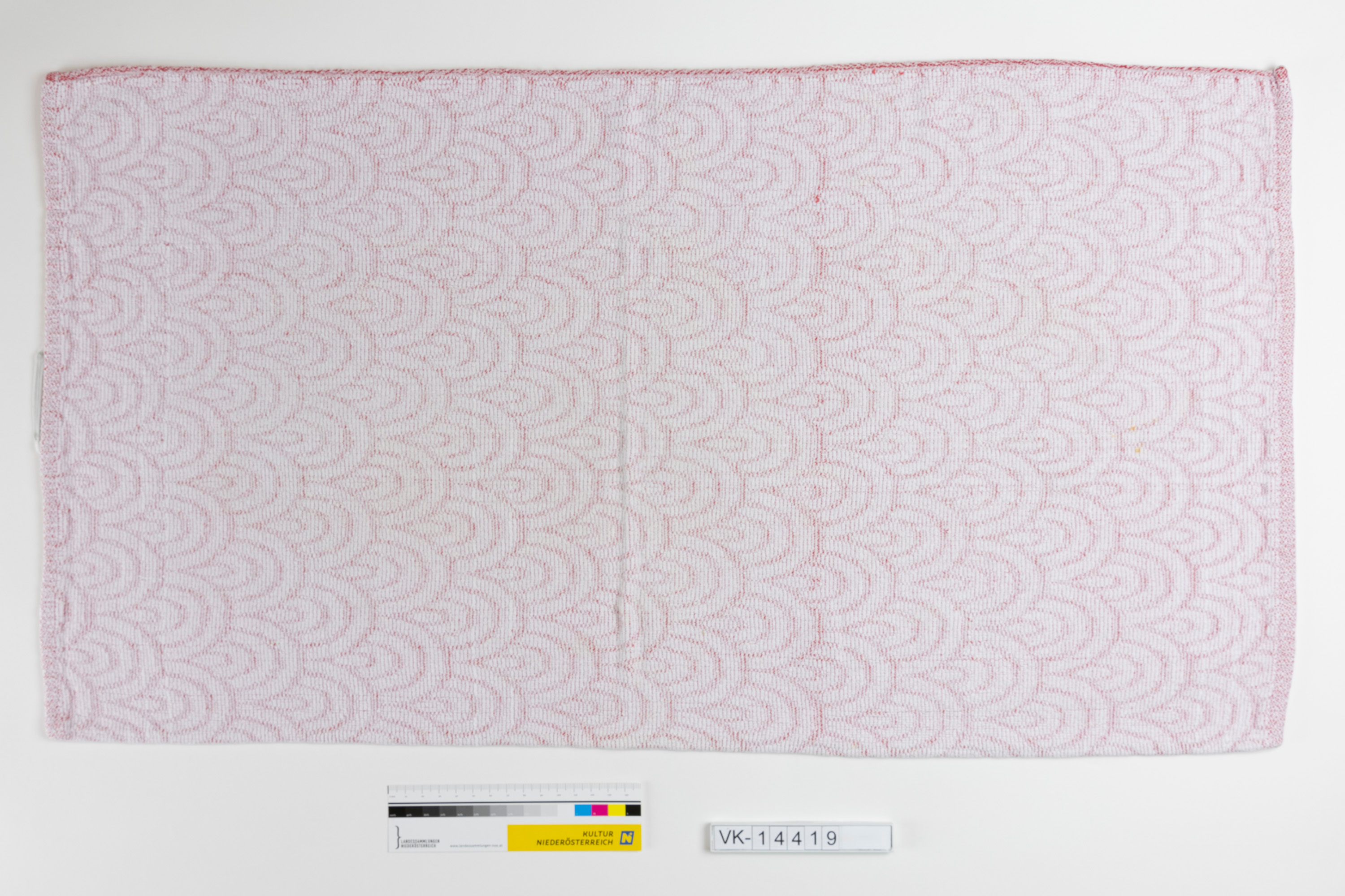 Weißes Frotteehandtuch mit rotem Schuppenmuster und einer weißen Aufhängeschlaufe.
