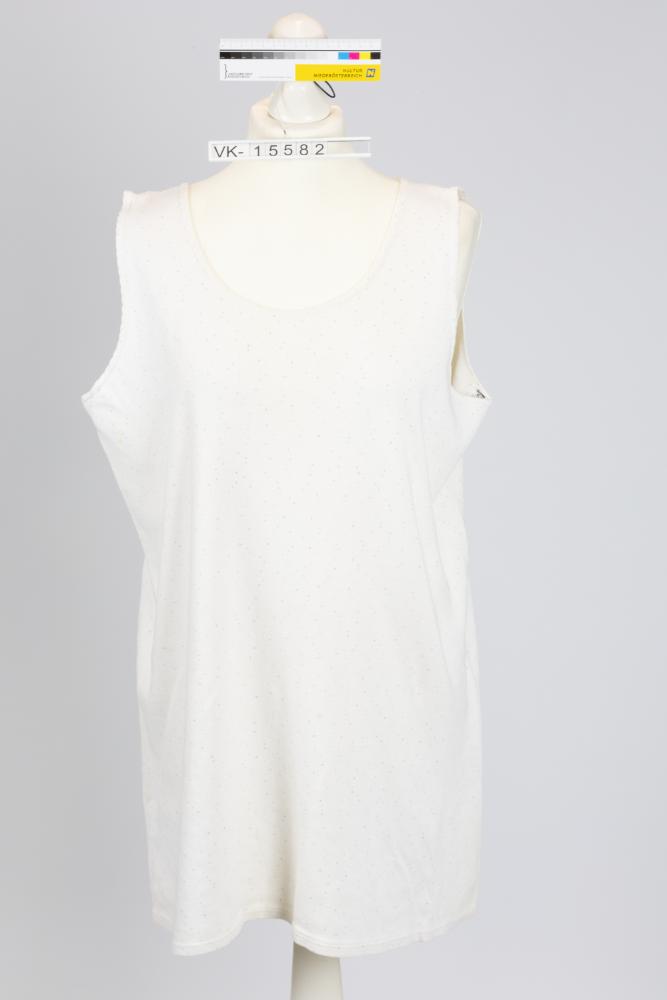 Weißes ärmelloses Unterleibchen mit feinen blauen und roten Punkten.
