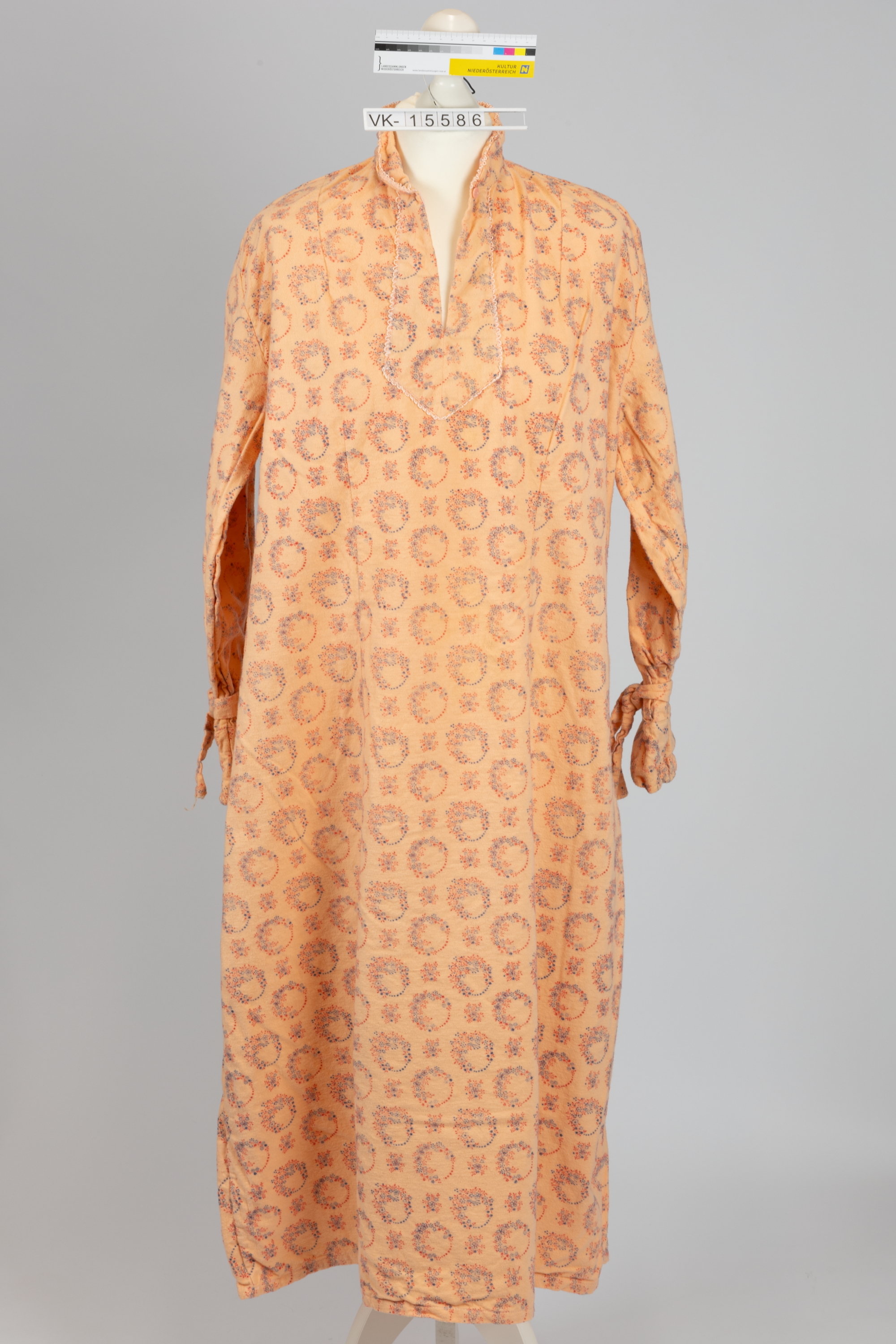 Langärmeliges Nachthemd aus lachsfarbenem Stoff, mit rot-blauen runden Blütenelementen bedruckt. Im Kragen befindet sich ein Etikett mit der Aufschrift: "4".