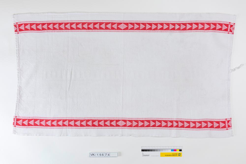 Weißes Baumwollhandtuch mit zwei rot-hellroten geometrischen Musterstreifen an den Längsseiten.