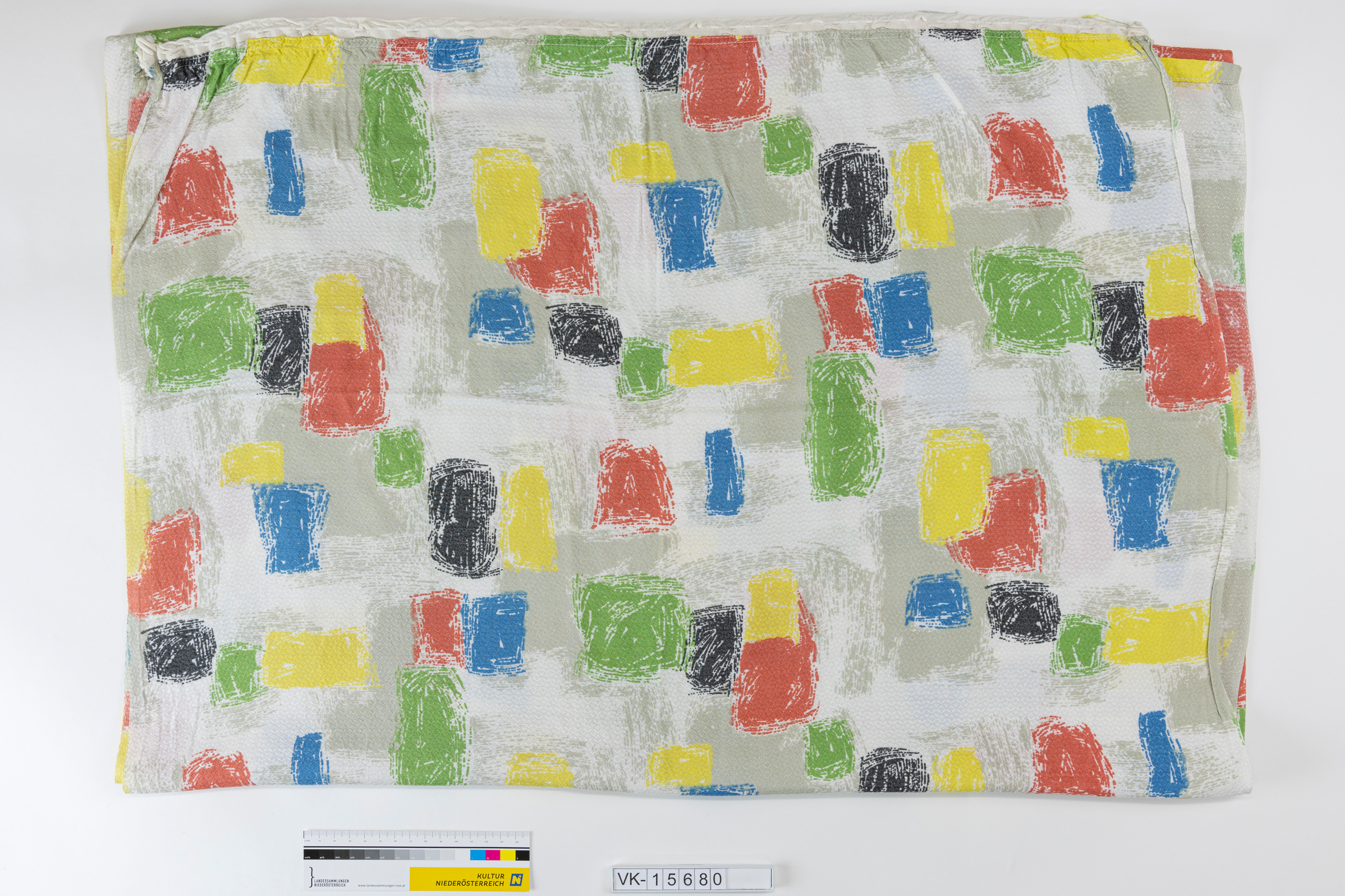 Vorhang mit weißer Grundfarbe und aufgedrucktem, abstraktem, mehrfärbigem Muster.