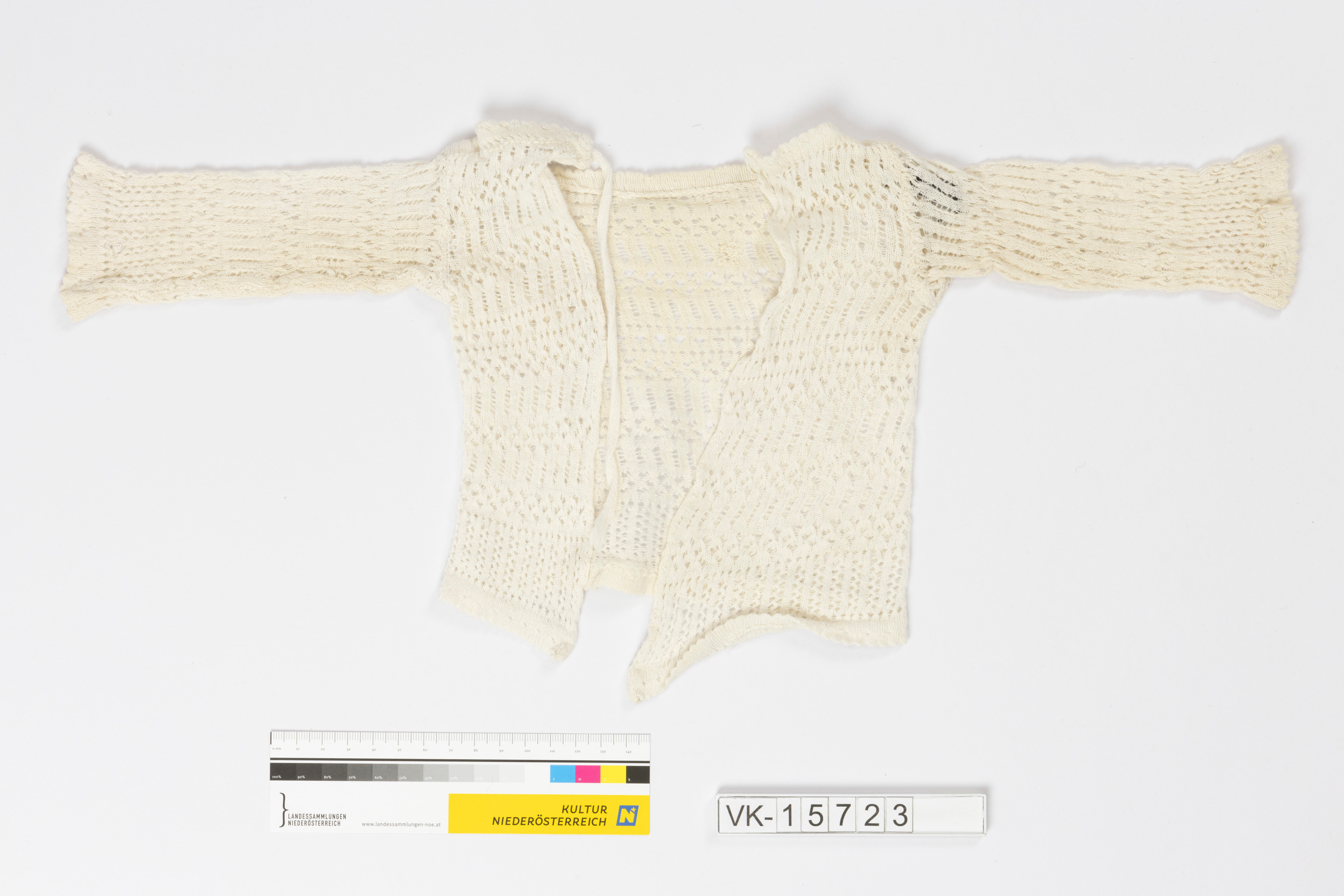 Langärmeliges, in durchbrochenen Mustern gestricktes, weißes Babyjäckchen mit Zugbändchen am Hals.