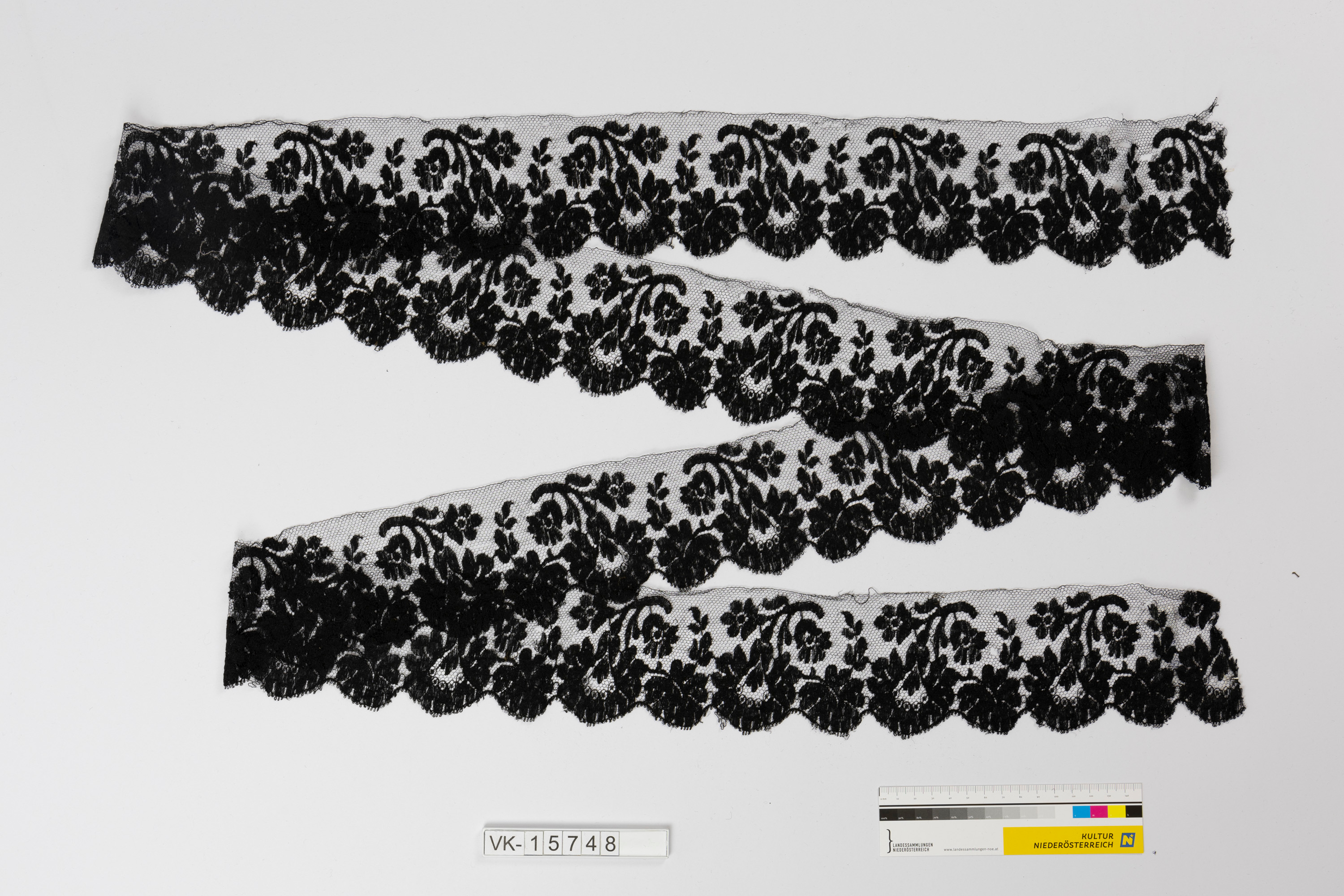 Schwarzes Tüllspitzenband mit Bogenkante und floraler Verzierung.