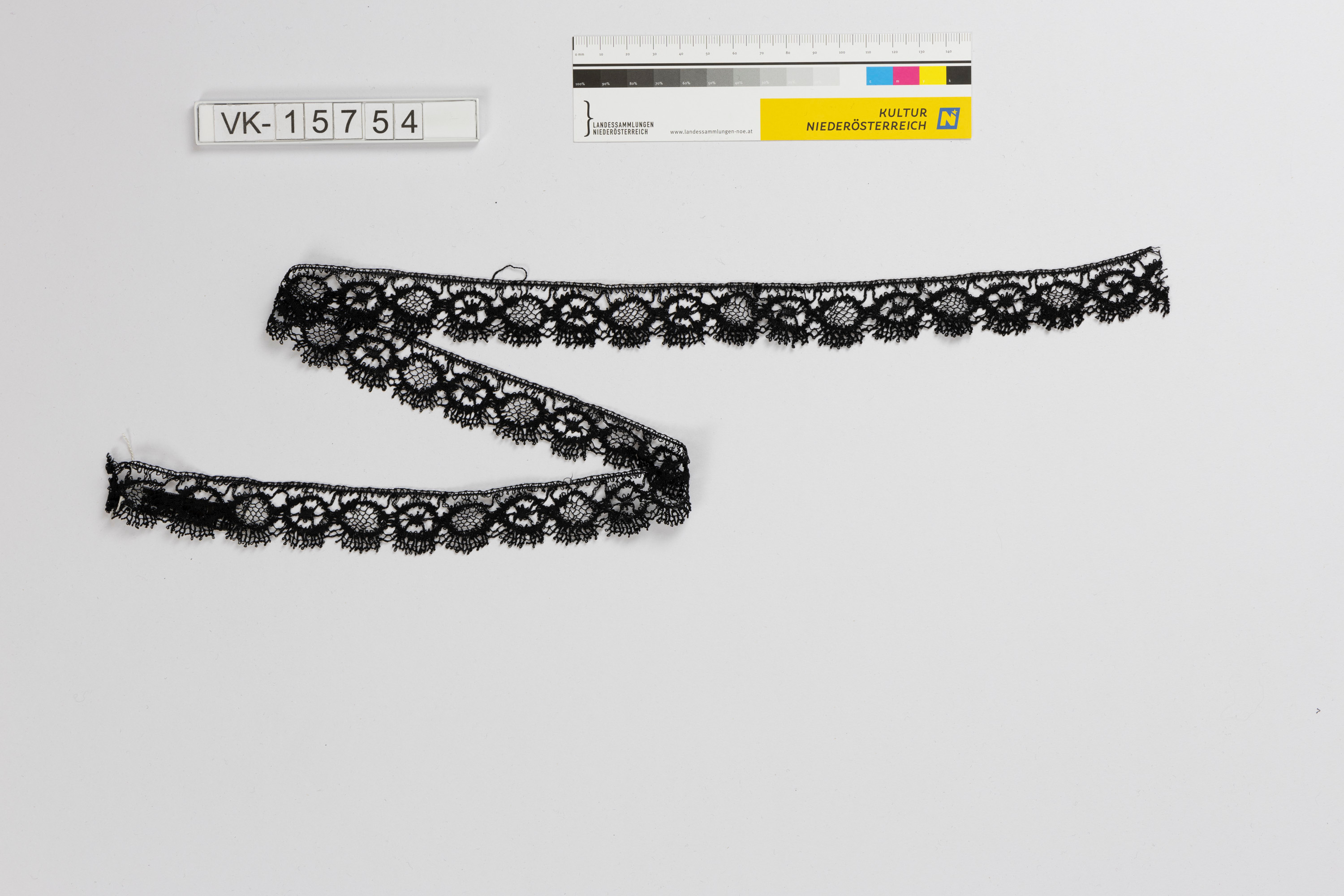 Schwarze Spitzenborte mit ovalen Elementen, die abwechselnd fein und grob vernetzt sind.