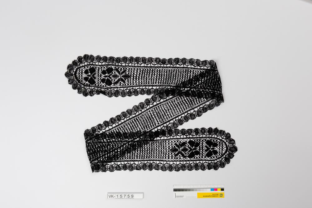 Schwarzer Häkelspitzenschal mit runden Enden und durchbrochenem Karomuster; im Randbereich ist der Schal mit einer Reihe aus ovalen Elementen gefasst, an den Enden sind schmetterlingsähnliche Musterelemente.