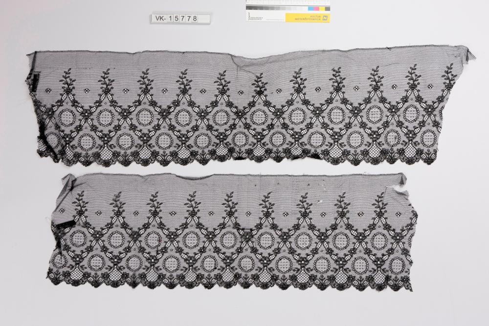 Zwei Teilstücke (a, b) eines schwarzen Tüllbandes, das durchbrochen mit einem ornamental-floralen Muster (Rosetten, Blütenbänder, Bogenkante) verziert ist.
