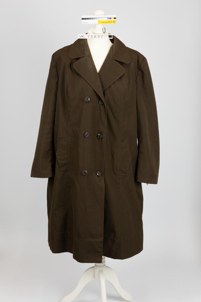 Brauner zweireihiger Damenmantel mit braunen Knöpfen.